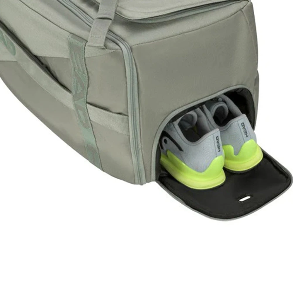 The PRO DUFFLE BAG L LNLL – which is endorsed by Matteo Berrettini and matches HEAD’s EXTREME racquet series – is a stylish travel companion. Upgraded with a new shape, this bag gives you the space you need when you’re on the road. You can comfortably fit up to 9 racquets in the two spacious compartments. The additional inside mesh pocket and the outside pocket provide additional space for quick access, while the 2-way carry system lets you pick whether you want to flip the bag over your shoulder or onto your back for extra flexibility. The climate control technology CCT+ in one of the main compartments protects your racquets from higher temperatures. Colour Shown: Light Green / Liquid Lime.