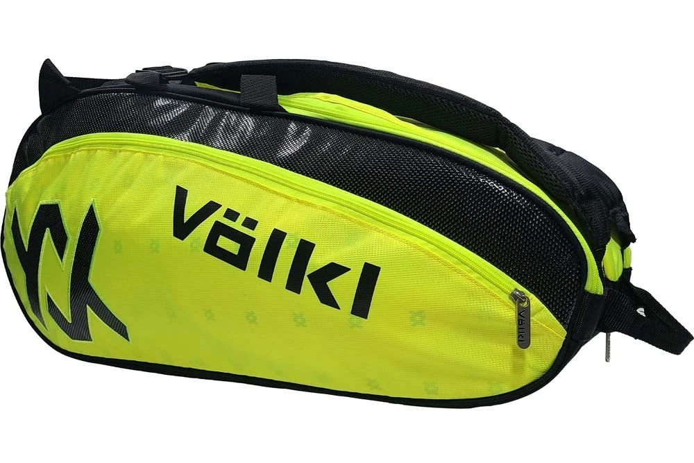 This Volkl Bag have two racquet compartments, one with silver thermal climate controlled lining. Two zippered front sleeve pockets for valuables. One inside zippered pocket for valuables. One zippered shoe pocket. Holds six to nine racquets.