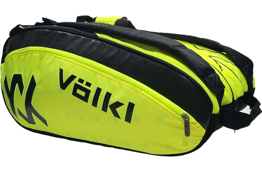 This Volkl Bag have three racquet compartments, one with silver thermal climate controlled lining. Two zippered front sleeve pockets for valuables. One inside zippered pocket for valuables. One zippered shoe pocket. Holds nine to twelve racquets.