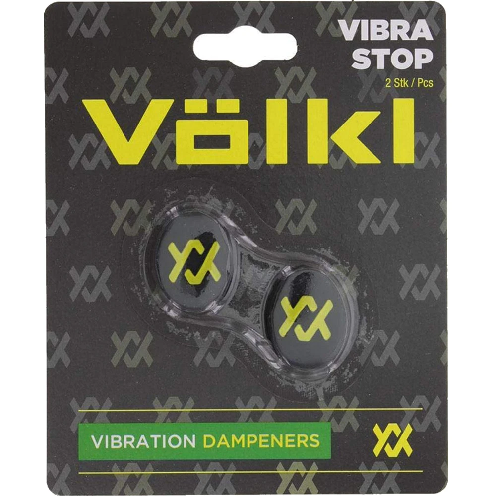 The Vibrastop 2 pack bears the Volkl logo. Additionally, they change the frequency of the strings, resulting in a solid sound on impact and reduced string vibration.