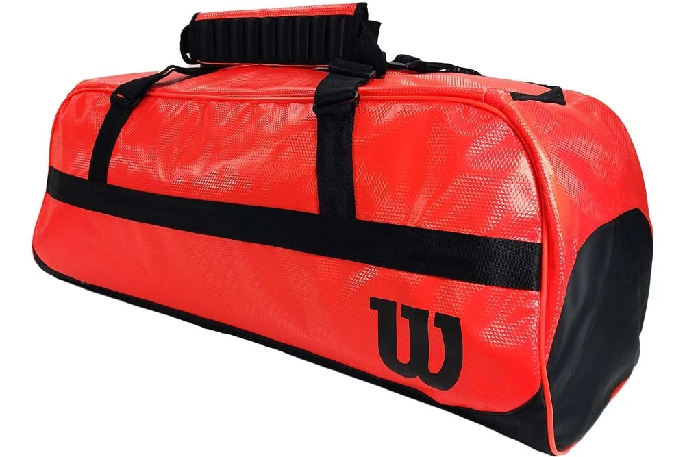 Travel smart with the Tour Duffel, a large bag designed to maximize efficiencies for tennis players on the go. Smart organization in the main compartment features an interior divider system that keeps equipment, clothing, and personal items in place. A separate racket compartment holds up to 3-4 rackets, while side zip pockets allocate space for shoes and valuables to satisfy the loftiest of travel demands from players. Colour Shown: Red.